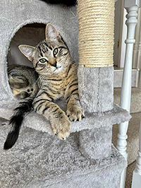 2 years old -A family found her pregnant, starving, ill, alone, and carrying her last kittens with her at Gordon's Beach. She is a very petite girl with pneumonia (upper respiratory) when we rescued her. Unfortunately, it was too late to save her baby. Juliette was able to fight back the infection, she gained weight and got adopted by a couple who already has another cat.